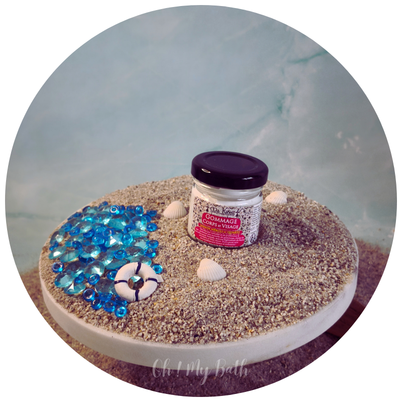 - Prélevez une noisette de gommage et appliquez sur peau humide.